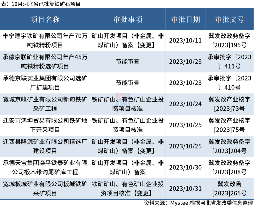 據(jù)不完全統(tǒng)計(jì),2023年10月河北省共批復(fù)鐵礦石相關(guān)項(xiàng)目8個,分別是2個節(jié)能審查、3個鐵礦礦山、有色礦山企業(yè)投資項(xiàng)目核準(zhǔn)【變更】和3個礦山開發(fā)項(xiàng)目(非金屬、非煤礦山)備案【變更】。