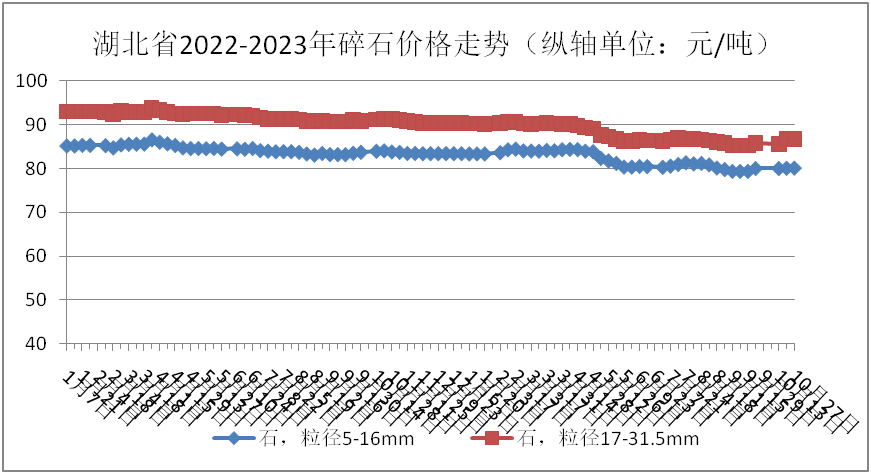 監(jiān)測(cè)數(shù)據(jù)顯示:10月份,碎石(粒徑5-16mm)、碎石(粒徑17-31.5mm)全省均價(jià)分別為80.09元/噸、86.39元/噸,環(huán)比分別上漲:0.69%、1.21%;同比分別下跌:4.65%和5.33%。具體價(jià)格走勢(shì)情況如下圖: