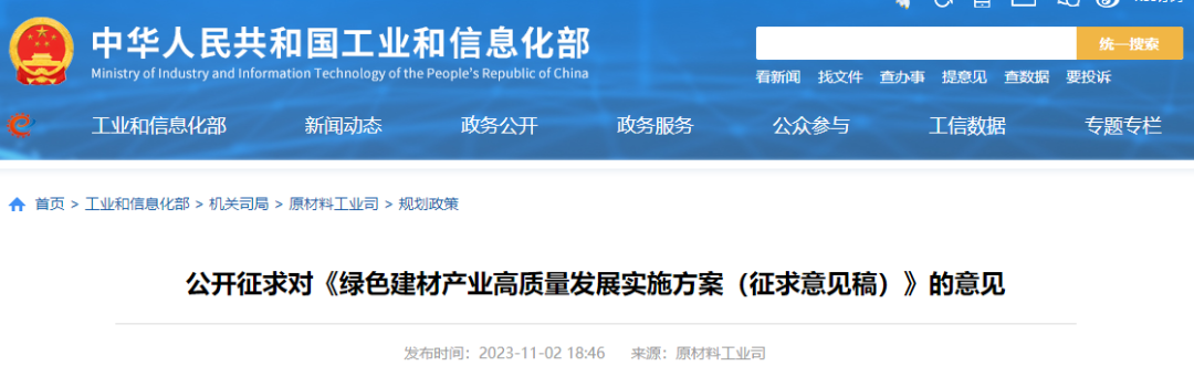 按照《中共中央 國務(wù)院關(guān)于完整準(zhǔn)確全面貫徹新發(fā)展理念做好碳達峰碳中和工作的意見》部署,為進一步加快綠色建材產(chǎn)業(yè)高質(zhì)量發(fā)展,工業(yè)和信息化部起草了《綠色建材產(chǎn)業(yè)高質(zhì)量發(fā)展實施方案(征求意見稿)》(見附件)。為進一步聽取社會各界意見,現(xiàn)予以公示。如有意見和建議,請于2023年11月9日前反饋。