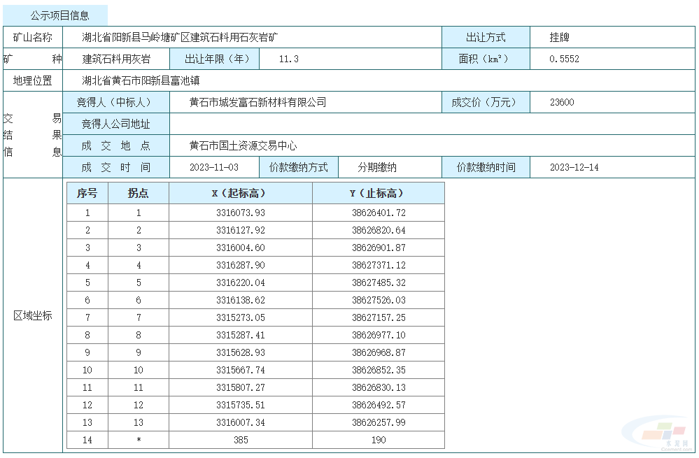 11月4日,湖北省陽新縣馬嶺塘礦區(qū)建筑石料用石灰?guī)r礦采礦權成功出讓,擬出讓11.3年,起始價2.36億元,黃石市城發(fā)富石新材料有限公司以2.36億元拿下。