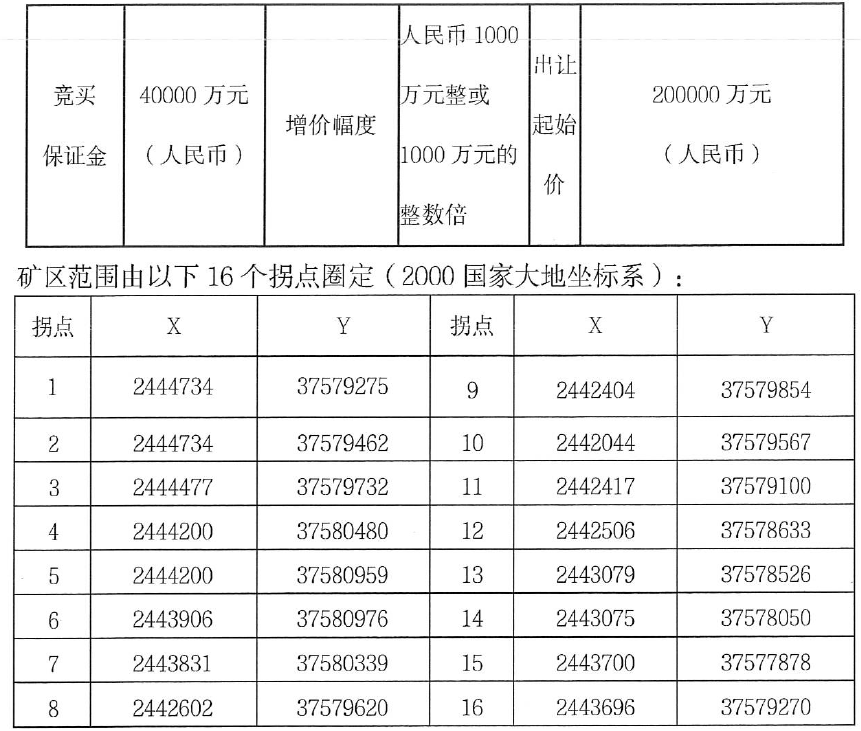 4、競買申請人須提供中華人民共和國境內(nèi)銀行或其分支機(jī)構(gòu)對競買申請人出具的人民幣100億元(含)以上的銀行流水證明(掛牌報(bào)價(jià)之日前1年內(nèi)流水);或提供競買申請人在中華人民共和國境內(nèi)銀行或其分支機(jī)構(gòu)存款余額為人民幣300000萬元(含)以上的存款證明文件(掛牌報(bào)價(jià)之日起1年內(nèi)有效)三、本次采礦權(quán)網(wǎng)上競價(jià)方式出讓按照價(jià)高者得原則確定競得人四、申請人可于2023年12月12日8時(shí)30分至2023年12月25日16時(shí)前,競買申請人可通過互聯(lián)網(wǎng)登錄陽江市土地與礦業(yè)權(quán)網(wǎng)上交易系統(tǒng)(https://jy.yjggzy.cn:8087/)或廣東省公共資源交易平臺交易系統(tǒng)(https://ygp.gdzwfw.gov.cn/ggzy-portal/#/441700/jyxt)申請參加競買,交納競買保證金到賬截止時(shí)間為2023年12月25日16時(shí)0分請錄網(wǎng)上交易系統(tǒng)詳閱“應(yīng)用指南”悉知相關(guān)的網(wǎng)上交易程、保證金繳納等操作方法。