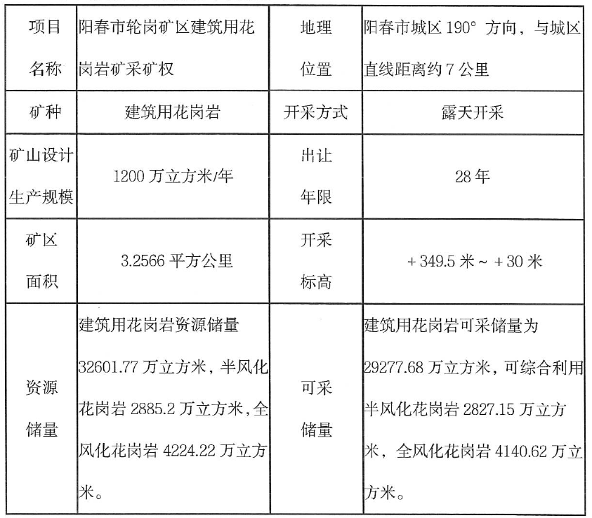 陽春市白然資源局委托陽江市公共資源交易中心以網(wǎng)上競價(jià)方式掛牌出讓1宗位于陽春市輪崗礦區(qū)建筑用花崗巖礦采礦權(quán)。現(xiàn)將有關(guān)事項(xiàng)公告如下: