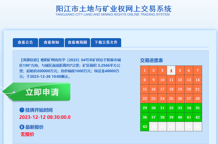 七、本次網(wǎng)上競價(jià)出讓的詳細(xì)資料和具體要求,見網(wǎng)上競價(jià)出讓文件。申請人即日起可登錄陽江市土地與礦業(yè)權(quán)網(wǎng)上交易系統(tǒng)獲取本次網(wǎng)上競價(jià)出讓文件。