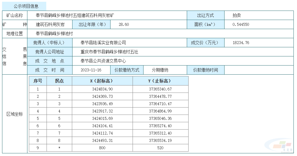 11月16日,重慶市奉節(jié)縣鶴峰鄉(xiāng)柳池村五組建筑石料用灰?guī)r礦采礦權成功出讓,擬出讓28.6年,起始價18234.76萬元,奉節(jié)縣陸溪實業(yè)有限公司以18234.76萬元拿下。
