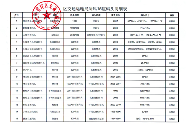 此次參與競拍的15座交通碼頭包括,桃花茅草屋客運要公頭、蝦峙柵棚碼頭、六橫大番碼頭、東極黃興島交通碼頭、東極東福山大香碼頭、白沙沙頭島交通碼頭、普陀柴山陸島交通碼頭、葫蘆碼頭、登步蛭子港交通碼頭、登步車渡碼頭、蝦峙西白蓮交通碼頭、蝦峙東白蓮交通碼頭、螞蟻車渡碼頭、六橫元山島碼頭、佛渡交通碼頭、桃花茅草屋客運要公頭、蝦峙柵棚碼頭、六橫大番碼頭、東極黃興島交通碼頭、東極東福山大香碼頭、白沙沙頭島交通碼頭、普陀柴山陸島交通碼頭、葫蘆碼頭、登步蛭子港交通碼頭、登步車渡碼頭、蝦峙西白蓮交通碼頭、蝦峙東白蓮交通碼頭、螞蟻車渡碼頭、六橫元山島碼頭、佛渡交通碼頭。