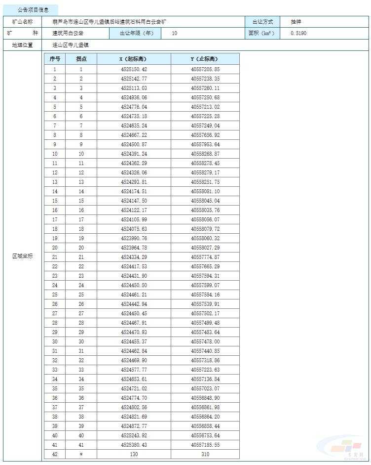 11月20日,葫蘆島市自然資源局連山分局發(fā)布公告,掛牌出讓遼寧省葫蘆島市連山區(qū)寺兒堡鎮(zhèn)后峪建筑石料用白云巖礦采礦權(quán),起始價(jià)7319.65萬(wàn)元。