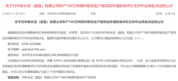 湖南永州市生態(tài)環(huán)境局道縣分局發(fā)布消息稱,經(jīng)審查,對華新水泥(道縣)有限公司年產(chǎn)100萬噸骨料移動生產(chǎn)線項目環(huán)境影響評價文件作出審批決定,同意項目建設(shè)。
