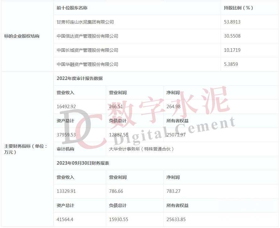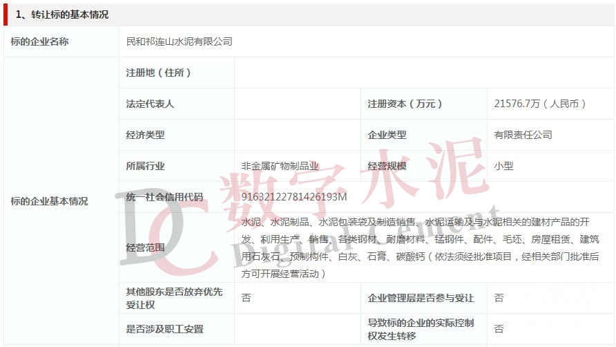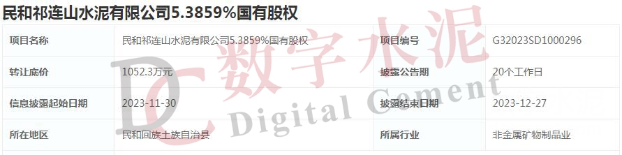 底價1052.3萬元!民和祁連山水泥5.4%國有股權(quán)轉(zhuǎn)讓