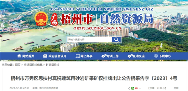 12月10日,廣西梧州市自然資源局發(fā)布梧州市萬秀區(qū)思扶村真祝建筑用砂巖礦采礦權(quán)掛牌出讓公告。該礦建筑用砂巖礦(控制+推斷)資源量為4399.16萬方(超1.2億噸),設(shè)計生產(chǎn)規(guī)模共851.03萬噸/年(建筑用砂巖600萬噸/年、綜合利用回填骨料251.03萬噸/年),擬出讓年限17年,起始價2.29億元。
