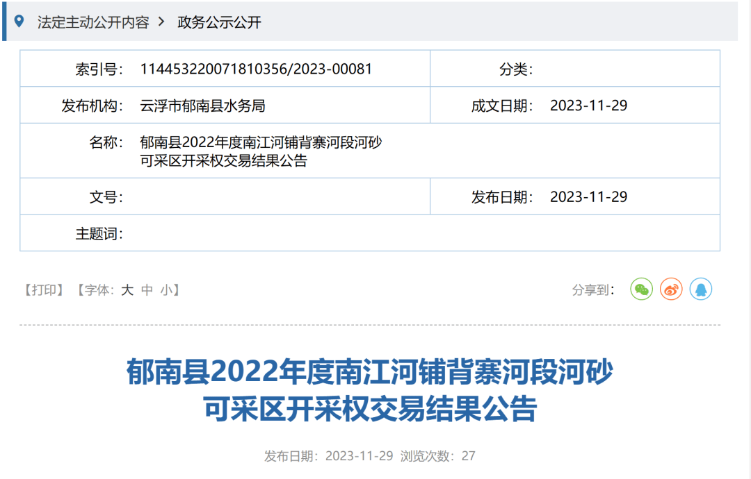 2023年5月第二次掛牌,開采時(shí)間為5個(gè)月,起始價(jià)為1021.326萬(wàn)元,每方河砂86.7元。