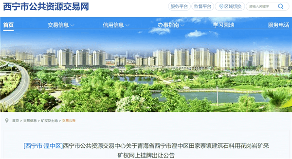 12月5日,青海省西寧市公共資源交易網(wǎng)發(fā)布西寧市湟中區(qū)田家寨鎮(zhèn)建筑石料用花崗巖礦采礦權網(wǎng)上掛牌出讓公告。該礦資源儲量共8126.4萬方,生產(chǎn)規(guī)模為300萬方/年,出讓年限21.8年,起始價未知。網(wǎng)上掛牌時間2024年1月3日-2024年1月17日。