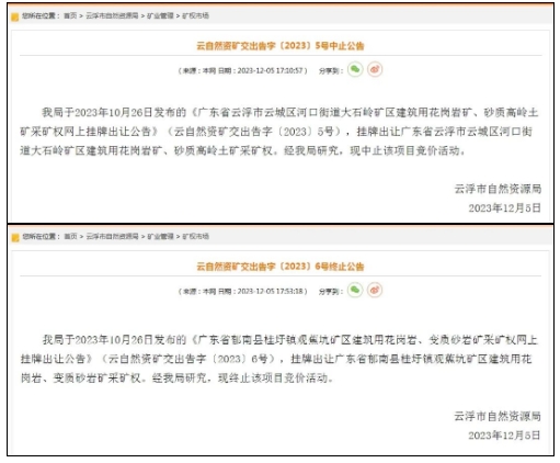廣東礦業(yè)局勢(shì)突變:觀蕉坑、大石嶺礦區(qū)出讓計(jì)劃被叫停!12月5日,主管部門宣布終止礦權(quán)出讓,觀蕉坑礦區(qū)的建筑用花崗巖、變質(zhì)砂巖礦,以及大石嶺礦區(qū)的建筑用花崗巖礦、砂質(zhì)高嶺土礦,一時(shí)引起市場(chǎng)轟動(dòng)。