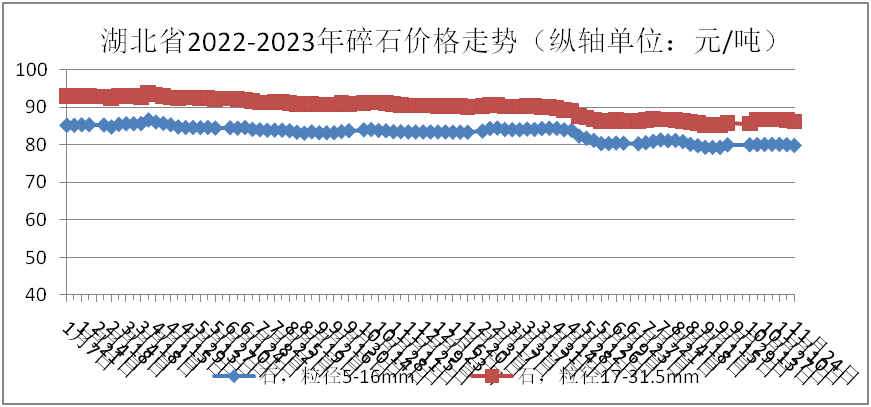 碎石(粒徑5-16mm)、碎石(粒徑17-31.5mm)全省均價分別為80.07元/噸、86.60元/噸。