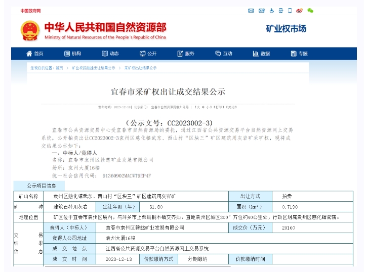 12月13日,江西省宜春市袁州區(qū)慈化鎮(zhèn)武東、西山村“區(qū)塊三”礦區(qū)建筑用灰?guī)r礦采礦權成功出讓,起始價2億元,宜春市袁州區(qū)贛慈礦業(yè)發(fā)展有限公司以2.01億元拿下,溢價100萬元。