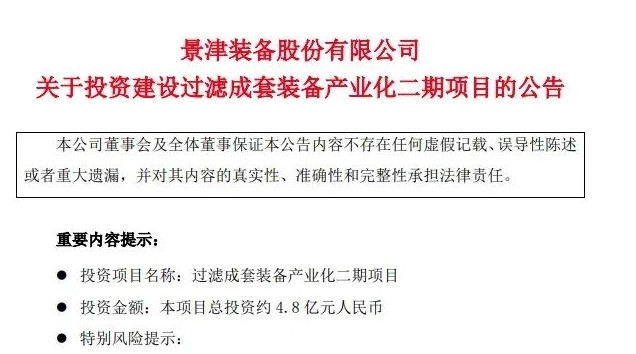 景津裝備表示,上述投資項目處于初始階段,尚未取得項目用地,尚未完成可行性論證及環(huán)境影響評價等工作,項目尚存在較多不確定性。公司將積極關(guān)注上述項目的進(jìn)展情況,并依據(jù)有關(guān)規(guī)定履行相關(guān)信息披露義務(wù)。