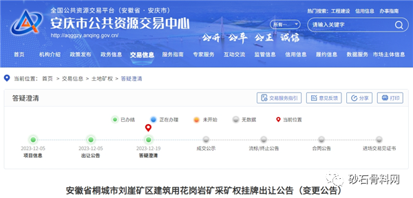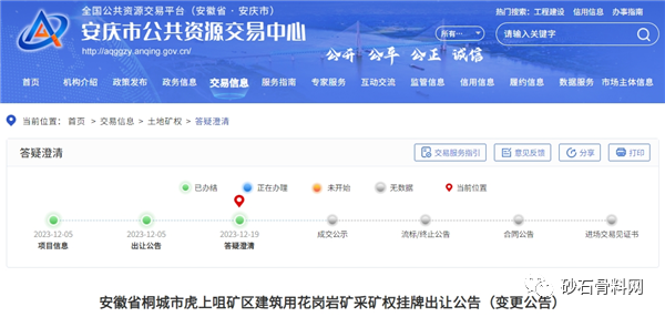日前,安徽省安慶市公共資源交易平臺發(fā)布了兩宗砂石礦掛牌出讓變更公告。據(jù)悉,兩宗砂石礦出讓公告均刪除了企業(yè)注冊資金要求及需要額外支付的條款,并變更了出讓時(shí)間。