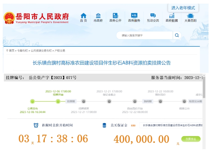 近日,湖南省汨羅市長樂鎮(zhèn)人民政府掛牌出讓長樂鎮(zhèn)合旗村高標(biāo)準(zhǔn)農(nóng)田建設(shè)項(xiàng)目伴生砂石AB料資源,據(jù)了解,本次拍賣按單價(jià)起拍,起拍價(jià)為人民幣每噸33元。基礎(chǔ)設(shè)施、耕地渠溝恢復(fù)履約保證金200萬元,預(yù)付款200萬元,合計(jì)400萬元整。拍賣成交后,買受方負(fù)責(zé)伴生砂石AB料的采挖、裝載、運(yùn)輸、銷售并承擔(dān)相關(guān)稅費(fèi)繳納。