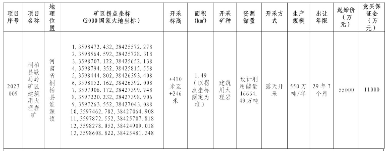 據(jù)環(huán)球破碎機(jī)網(wǎng)了解,桐柏縣歇馬嶺礦區(qū)建筑用大理巖礦位于河南省桐柏縣淮源鎮(zhèn),礦種為建筑用大理巖,設(shè)計(jì)利用儲(chǔ)量16664.49萬噸,出讓年限29年7個(gè)月,起始價(jià)55000萬元,競買保證金11000萬元。