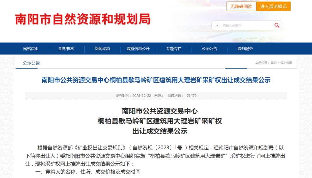 12月22日,南陽市公共資源交易中心桐柏縣歇馬嶺礦區(qū)建筑用大理巖礦采礦權(quán)出讓成交結(jié)果公示,該礦權(quán)由南陽新山石材有限公司以底價(jià)競得,成交價(jià)55000萬元。