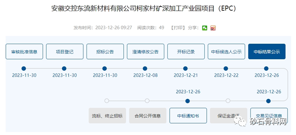 12月26日,安徽交控東流新材料有限公司柯家村礦深加工產(chǎn)業(yè)園項(xiàng)目(EPC)公布中標(biāo)結(jié)果,中標(biāo)人為中國(guó)電建集團(tuán)成都勘測(cè)設(shè)計(jì)研究院有限公司、中國(guó)水利水電第十工程局有限公司聯(lián)合體。投標(biāo)報(bào)價(jià)約13.13億元,建設(shè)周期215天日歷天。