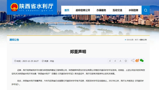 聲明中說(shuō),2023年汛后,陜西省已全面推行河道采砂許可電子證照,紙質(zhì)采砂許可證全面廢止。2023年以來(lái),陜西省水利廳從未核發(fā)過(guò)《河道采砂許可證》。
