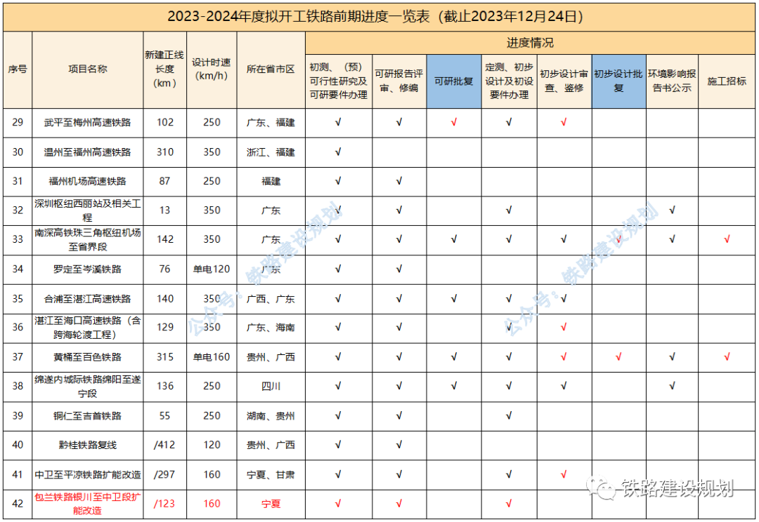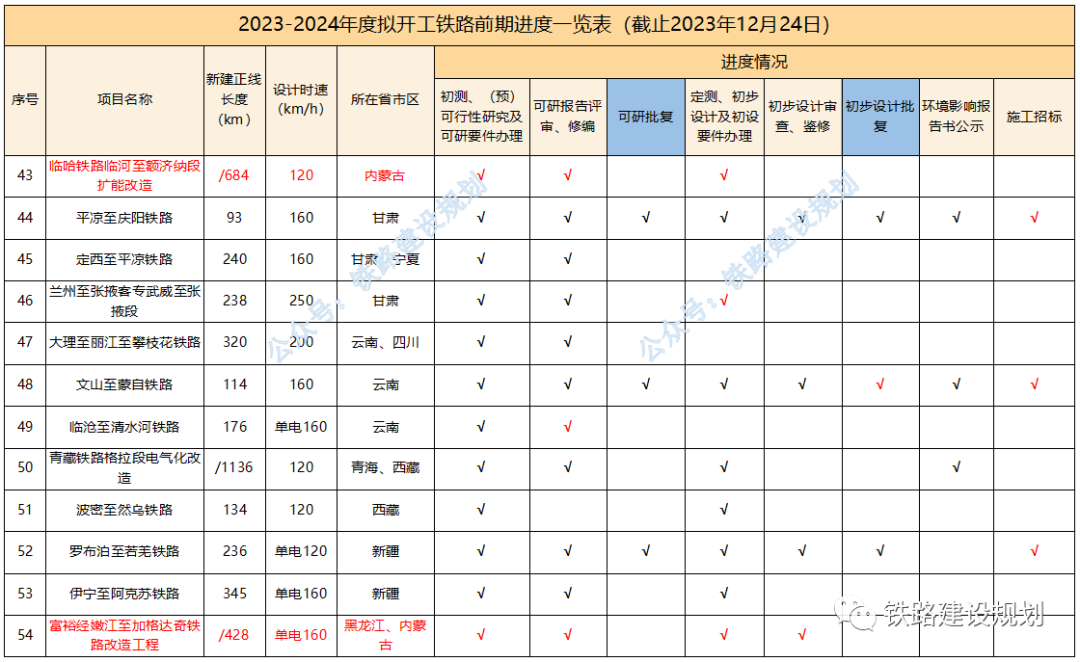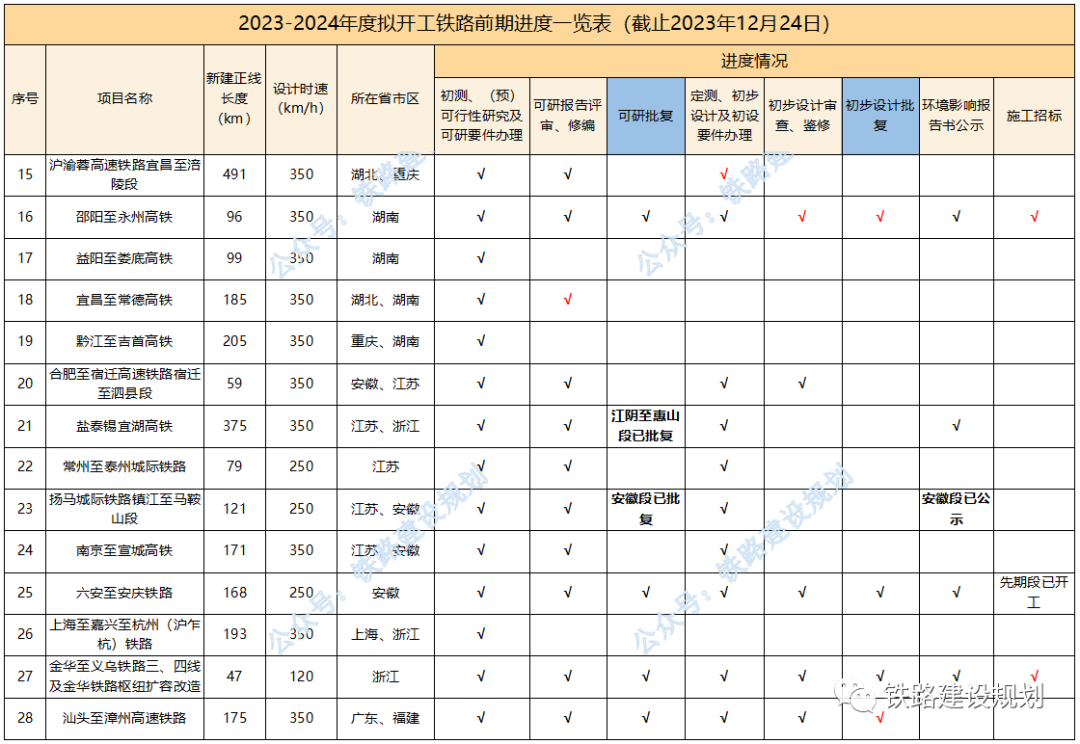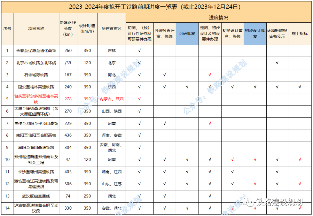 今年以來,已有延榆、邵永、濰宿、合武、濟棗等多個高鐵項目和黃百、平慶、蒙文、羅若等多個普鐵項目以及格庫鐵路等擴能改造項目實現(xiàn)開工目標。 2024年,國家鐵路推進的重點依然是“八縱八橫”高鐵通道未貫通路段的建設(shè),包括呼南高鐵焦洛平段、宜常段,沿江高鐵宜涪段,沿海高鐵溫福段,包(銀)海高鐵包鄂榆段等,以及都市圈重點城際鐵路如石雄城際等,如進展順利,年底前有望開工。 原計劃今年開工,因各種原因有所推遲的長贛、湛海、合湛高鐵也有望在明年初實現(xiàn)開工目標;近期漳汕高鐵、武平至梅州高鐵有望啟動施工招標。 包括已納入“十四五”鐵路開工計劃,但在2023年進展不明顯的項目,如:長遼通、牡敦、太綏、滬乍杭、阜黃、蘭張高鐵武張段,武漢樞紐直通線、大麗攀、溫武吉、常岳九、文山至靖西鐵路等,預(yù)計在2024年會有大的突破。 “十四五”規(guī)劃研究項目,包括南信合、黔吉高鐵等,均屬于省際城際鐵路性質(zhì),國家不主導建設(shè),全面開工預(yù)計需到2025年左右。 各項目最新進展情況匯總?cè)缦拢?023年10月1日以來): 1、合肥至武漢、濰坊至宿遷、邵陽至永州、南深高鐵廣東段,黃桶至百色、平?jīng)鲋翍c陽、文山至蒙自鐵路,鄭州樞紐、金華地區(qū)擴容改造相關(guān)工程初步設(shè)計均已批復,施工已招標; 2、長沙至贛州高鐵環(huán)境影響報告書生態(tài)環(huán)境部已暫緩審查,正完善長沙城區(qū)段環(huán)評相關(guān)措施,初步設(shè)計待批復; 3、沿江高鐵宜昌至涪陵段可研報告國家發(fā)改委已完成評估,待批復;用地預(yù)審已獲自然資源部批復; 4、呼南高鐵宜昌至常德段國鐵集團已完成可研鑒修審查,正推進可研審批相關(guān)前置要件辦理; 5、呼南高鐵焦洛平段用地預(yù)審已正式獲得自然資源部批復; 6、漳州至汕頭高鐵初步設(shè)計已批復,具備施工招標條件; 7、龍龍高鐵武平至梅州段可研已批復,初步設(shè)計11月底已通過國鐵集團審查待批復; 8、合浦至湛江高鐵受廣西段環(huán)評影響,調(diào)整初步設(shè)計待批復;湛江至??诟哞F可研待批復; 9、鹽泰錫常宜高鐵過江通道段已完成可研咨詢,正推進可研批復; 10、綿遂內(nèi)城際鐵路綿陽至遂寧段初步設(shè)計僅剩接軌方案未批復,明年初有望開工; 11、中衛(wèi)至平?jīng)鲨F路擴能改造工程初步設(shè)計已通過國鐵集團審查; 12、新增年度計劃開工及儲備開工項目: 包頭至鄂爾多斯至榆林高鐵,正開展可研前期工作;包蘭鐵路銀川至中衛(wèi)段擴能改造工程,已完成可研評審;臨哈鐵路臨河至額濟納段擴能改造工程,已完成可研鑒修審查;富裕至加格達奇鐵路改造工程,已通過初步設(shè)計預(yù)審。 2023-2024年度計劃開工鐵路前期進度一覽表▼ 基建是國家經(jīng)濟發(fā)展的核心,也是砂石骨料需求的主要來源,2024年如果大量高鐵、高速、城中村改造項目能夠落實的話,有望為提振國內(nèi)砂石市場態(tài)勢發(fā)揮積極作用。 但同時,我們也要客觀考慮另外一個問題,近幾年砂石礦權(quán)投資熱度持續(xù)高漲,部分地區(qū)產(chǎn)能釋放過度,長江地區(qū)已經(jīng)出現(xiàn)了明顯產(chǎn)能過剩的情況,隨著國家宏觀政策的調(diào)整、經(jīng)濟的持續(xù)向好回升以及基建對砂石需求的拉動,在一定程度上可以抵消產(chǎn)能過剩帶來的負面影響,但隨著新砂石礦山的陸續(xù)投產(chǎn)