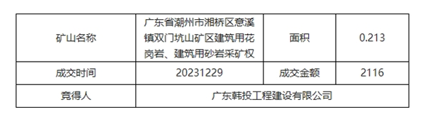 擬設(shè)礦區(qū)位于潮州市30°方位、直距約6km處,行政區(qū)劃隸屬湘橋區(qū)意溪鎮(zhèn)管轄,面積為0.213平方千米。礦區(qū)中心有約1km的簡易公路與231省道相連,可達湘橋區(qū)、潮州市城區(qū),通往全國各地。競得人廣東韓投工程建設(shè)有限公司成立于2021年1月,注冊資本1000萬元,由2個自然人分別持股70%和30%。