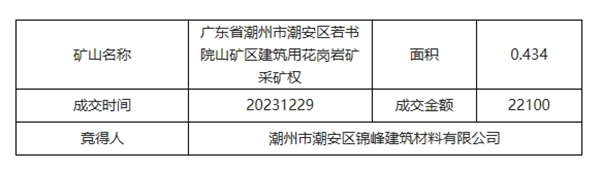 該礦資源儲量2313.14萬方,可采儲量為建筑用花崗巖資源量2035.69萬方,生產(chǎn)規(guī)模150萬方/年,擬出讓年限14年9個月,起始價21100萬元(約2.1億元),成交價22100萬元(約2.2億元)。