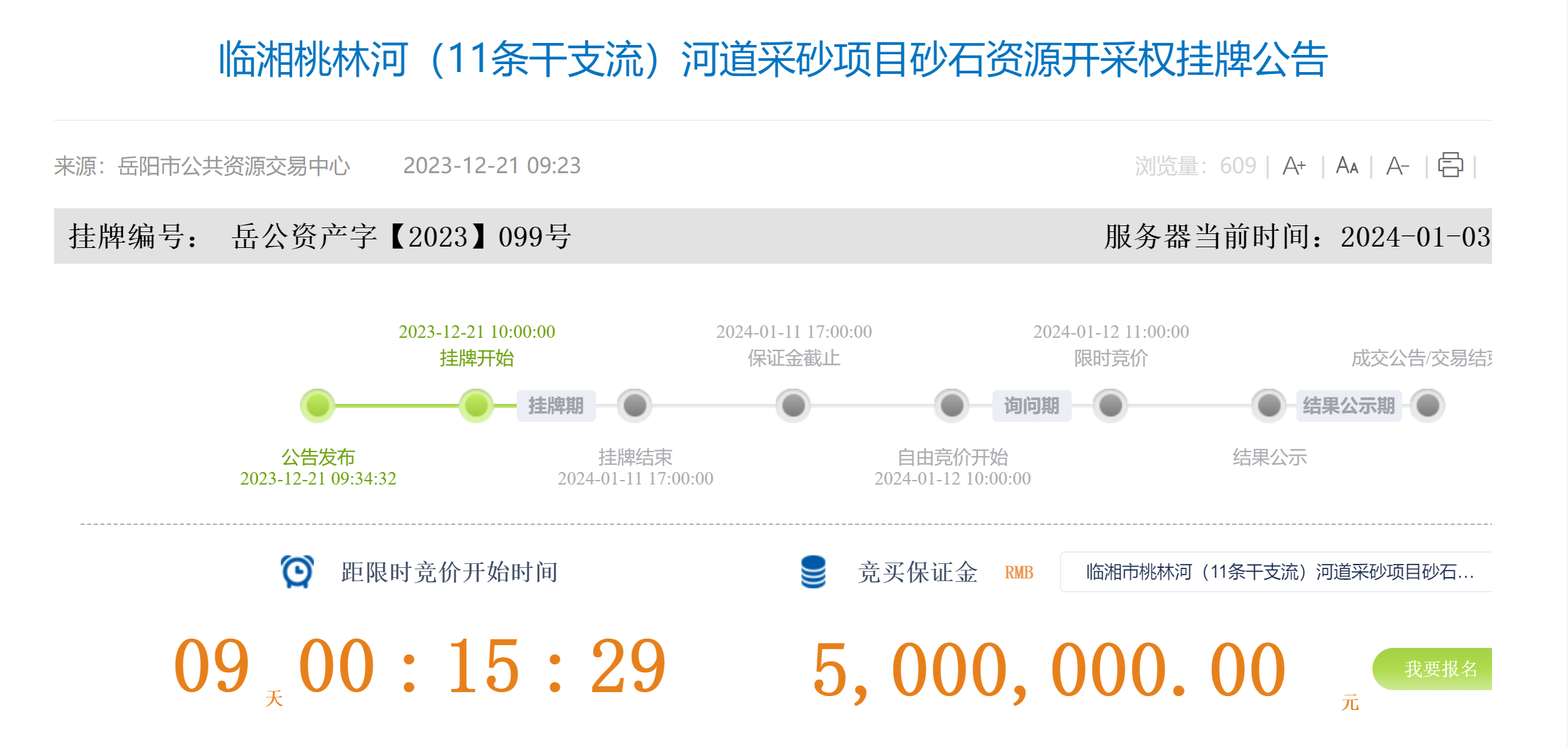 湖南省岳陽市臨湘桃林河(11條干支流)河道采砂項(xiàng)目砂石資源開采權(quán)開始掛牌。2024年1月11日結(jié)束掛牌,2024年1月12日開啟限時(shí)競價(jià)。本次拍賣標(biāo)的為該采砂項(xiàng)目10年砂石資源開采權(quán),砂石總量為1960萬噸,起拍價(jià)超7.2億元(72256.14萬元)。