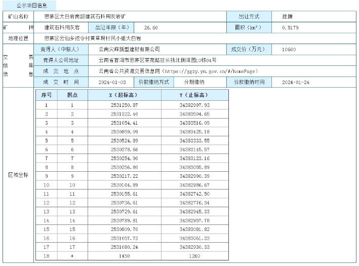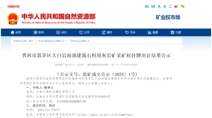 近日,普洱市思茅區(qū)自然資源局成功出讓普洱市思茅區(qū)大白巖南部建筑石料用灰?guī)r礦采礦權(quán),云南尖峰新型建材有限公司以掛牌起始價(jià)10600萬元成功競(jìng)得此礦權(quán)。出讓年限26.57年,資源儲(chǔ)量13719萬噸,平均拍得資源單價(jià)不足1元,僅0.77元/噸。