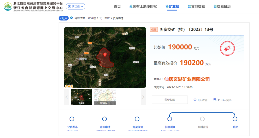 一、出讓人信息 1、采礦權(quán)出讓人:仙居縣自然資源和規(guī)劃局 2、地址:仙居縣省耕西路77號市民中心商務(wù)辦公樓東燦4樓 二、競得人信息 1、采礦權(quán)競得人:仙居玄湖礦業(yè)有限公司 2、法定代表人:徐海沙 3、公司注冊地址: 浙江省臺州市仙居縣安洲街道市橋社區(qū)城北西路66號 三、掛牌情況 1、掛牌期:2023年12月13日至2023年12月26日 2、掛牌成交時間:2023年12月26日 3、掛牌成交地點(diǎn):浙江省礦業(yè)權(quán)交易系統(tǒng) 4、掛牌起始價:190000萬元 5、掛牌成交價:190200萬元 6、出讓收益繳納方式及時間: 本采礦權(quán)按出讓金額形式征收礦業(yè)權(quán)出讓收益,由受讓人分6期向國家稅務(wù)總局仙居縣稅務(wù)局申報繳納。采礦權(quán)人自愿一次性繳清的除外。 第一期:受讓人在收到稅務(wù)部門開具的繳款通知書之日起30日內(nèi)繳納礦業(yè)權(quán)出讓收益總額的20%; 第二期至第六期:自2024年起,受讓人在每年11月30日前繳納礦業(yè)權(quán)出讓收益總額的16%。 四、采礦權(quán)的基本情況 1、礦山名稱:浙江省仙居縣上張鄉(xiāng)上張村后老坑建筑用玄武巖礦 2、地理位置:仙居縣上張鄉(xiāng)上張村后老坑 3、開采礦種:建筑用玄武巖(84555)、建筑用石料(凝灰?guī)r)(84853) 4、礦區(qū)范圍:由71個拐點(diǎn)圈定,礦區(qū)面積約0.6082平方千米,礦區(qū)開采標(biāo)高自+595.00米至+400.00米,具體范圍拐點(diǎn)坐標(biāo)見表1。 5、采礦權(quán)出讓期限:自采礦許可證頒發(fā)之日起12年 6、生產(chǎn)規(guī)模:550萬噸/年 7、資源儲量:浙江省有色金屬地質(zhì)勘查院編制了該項(xiàng)目勘查地質(zhì)報告及資源量分割報告,經(jīng)紹興鑫達(dá)礦產(chǎn)資源儲量評審科技咨詢有限公司和北京中礦聯(lián)咨詢中心評審并出具資源儲量評審意見書(紹鑫審〔2023〕27號)、(中礦浙儲評字〔2023〕15號),礦區(qū)范圍內(nèi)出讓建筑用玄武巖礦控制資源量4044.03萬噸,建筑用流紋斑巖控制資源量78.7萬噸,宕碴1621萬噸,第四系殘坡積層剝離量216.57萬立方米。剝采比為0.1∶1(立方米/立方米)。 五、礦產(chǎn)資源開發(fā)利用要求 1、采礦權(quán)競得人需嚴(yán)格按照《浙江省綠色礦山管理辦法》(浙自然資規(guī)〔2022〕5號)、《關(guān)于全面推進(jìn)礦山數(shù)字化建設(shè)的通知》(浙自然資函〔2022〕104號)等要求進(jìn)行智能化綠色礦山建設(shè)和開發(fā)利用,修復(fù)改善礦區(qū)環(huán)境,美化采區(qū)地表景觀。礦山在正式投產(chǎn)6個月內(nèi)完成智能化綠色礦山建設(shè)和相關(guān)工作。 2、采礦權(quán)競得人需嚴(yán)格按照《浙江省礦山粉塵防治技術(shù)規(guī)范(暫行)》要求,做好礦山粉塵防治。礦山鑿巖、機(jī)械采掘、鉆孔、鏟裝等環(huán)節(jié)必須采取噴淋抑塵措施。生產(chǎn)過程中石料裝載、振動、破碎、篩分、儲存等環(huán)節(jié)應(yīng)全程封閉,采用濕式作業(yè)。礦區(qū)專用道路、成品料堆場做到地面硬化全覆蓋。為減少對周邊環(huán)境的影響,應(yīng)采取措施減少噪聲污染,礦區(qū)生產(chǎn)生活用水凈化達(dá)標(biāo)后才能外排,并使用水循環(huán)。 3、采礦權(quán)競得人需嚴(yán)格按照評審?fù)ㄟ^的施工設(shè)計(jì)方案要求,組織實(shí)施礦產(chǎn)資源開發(fā)利用、地質(zhì)環(huán)境保護(hù)及土地復(fù)墾工作。嚴(yán)格按照“邊開采、邊治理”的原則對礦區(qū)范圍內(nèi)的資源進(jìn)行開采,每年12月31日前向仙居縣自然資源和規(guī)劃局報告礦產(chǎn)資源開發(fā)利用情況、礦山地質(zhì)環(huán)境保護(hù)與治理實(shí)施情況。競得人應(yīng)在簽訂采礦權(quán)有償出讓合同之日起30日內(nèi)建立礦山地質(zhì)環(huán)境治理恢復(fù)與土地復(fù)墾基金賬戶,金額為8361.12萬元,計(jì)提標(biāo)準(zhǔn)按浙財(cái)綜〔2020〕14 號文件的相關(guān)要求執(zhí)行。采礦權(quán)競得人在礦山開發(fā)利用時需采取地質(zhì)災(zāi)害防治措施,所需費(fèi)用由競得人自行承擔(dān)。 4、為滿足礦產(chǎn)品外運(yùn)需求,仙居縣交通運(yùn)輸局可提供三條運(yùn)輸線路供競得人使用。競得人可根據(jù)實(shí)際需要自行選擇一條或多條線路用于礦產(chǎn)品外運(yùn),競得人可分期支付道路維護(hù)、保養(yǎng)費(fèi)用,道路的維護(hù)、保養(yǎng)由縣交通運(yùn)輸局負(fù)責(zé)。競得人須與縣交通運(yùn)輸局簽訂《礦產(chǎn)品運(yùn)輸?shù)缆肪S護(hù)(保養(yǎng))協(xié)議》,具體事宜按協(xié)議執(zhí)行。 5、項(xiàng)目前期相關(guān)報告編制費(fèi)用合計(jì)847萬元,由采礦權(quán)競得人在簽訂《采礦權(quán)競得人進(jìn)場施工保障協(xié)議》后10日內(nèi)一次性繳納至仙居縣財(cái)政局財(cái)政專戶。 6、礦區(qū)范圍內(nèi)占用林地55.9253公頃,競得人需繳納森林植被恢復(fù)費(fèi)共計(jì)1663.9310萬元,具體審批和繳費(fèi)事宜咨詢仙居縣自然資源和規(guī)劃局(聯(lián)系電話:0576-89371863)。 7、采礦權(quán)到期后,若出讓資源量仍有剩余,經(jīng)仙居縣自然資源和規(guī)劃局審定并報仙居縣人民政府同意后可延續(xù),延續(xù)時間不超過6年(若政策調(diào)整,從其規(guī)定)。 8、政策處理費(fèi)用,上張鄉(xiāng)人民政府已完成礦區(qū)范圍內(nèi)所涉及政策處理工作,并承諾保障