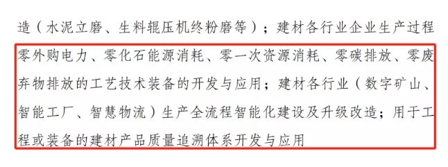 推動建材各行業(yè)企業(yè)生產(chǎn)過程零外購電力、零化石能源消耗、零一次資源消耗、零碳排放、零廢棄物排放的工藝技術(shù)裝備的開發(fā)與應(yīng)用; 建材各行業(yè)(數(shù)字礦山、智能工廠、智慧物流)生產(chǎn)全流程智能化建設(shè)及升級改造; 用于工程或裝備的建材產(chǎn)品質(zhì)量追溯體系開發(fā)與應(yīng)用。