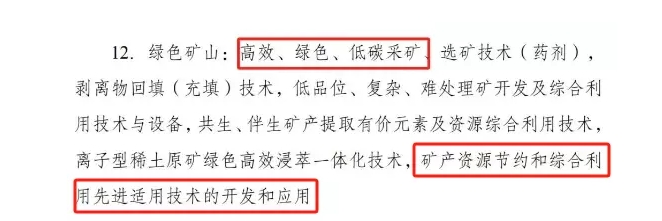 綠色礦山方面:高效、綠色、低碳采礦、選礦技術(shù),礦產(chǎn)資源節(jié)約和綜合利用先進(jìn)適用技術(shù)的開發(fā)和應(yīng)用。