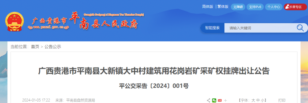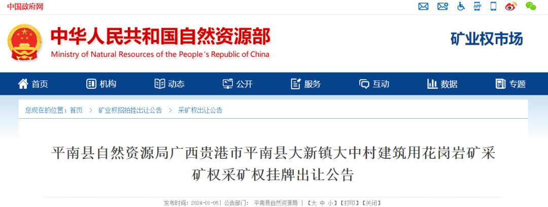 廣西貴港市平南縣大新鎮(zhèn)大中村建筑用花崗巖礦采礦權(quán)掛牌出讓公告
