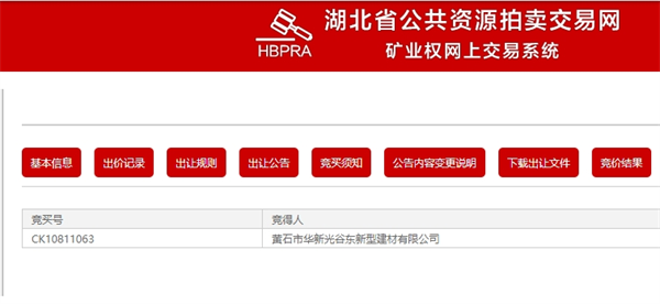 礦權(quán)出讓期限為13年,年產(chǎn)能500萬(wàn)噸。競(jìng)得方為黃石市華新光谷東新型建材有限公司,出資1.43億元競(jìng)得該項(xiàng)目。