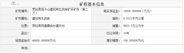 近日,四川雅安市自然資源和規(guī)劃局發(fā)布滎經(jīng)縣塔子山建筑用玄武巖礦采礦權(quán)拍賣出讓公告(第二次)。該礦權(quán)資源儲(chǔ)量:5503.3萬立方米(近1.7億噸),開采規(guī)模:不低于100萬噸/年(以實(shí)際頒證為準(zhǔn))。擬出讓年限:10年,起始價(jià):48000萬元。