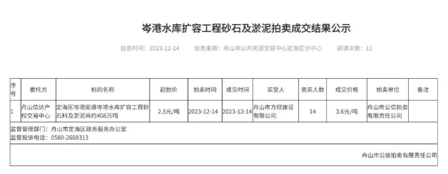 近日,浙江舟山岑港水庫(kù)擴(kuò)容工程砂石料及淤泥拍賣會(huì)在舟山市公共資源交易中心定海區(qū)分中心舉行,拍賣會(huì)現(xiàn)場(chǎng)競(jìng)拍人爭(zhēng)相舉牌激烈競(jìng)價(jià),最終以1468.80萬(wàn)元的總價(jià)成功拍出,溢價(jià)448.80萬(wàn)元,溢價(jià)率達(dá)44%。