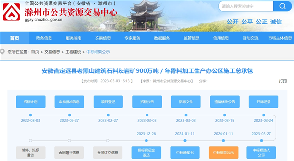2024年1月11日,安徽省滁州市定遠縣老黑山建筑石料灰?guī)r礦900萬噸/年骨料加工生產(chǎn)辦公區(qū)施工總承包公示中標結(jié)果。安徽祺瑞建設(shè)工程有限公司(聯(lián)合體牽頭人)與中國二冶集團有限公司聯(lián)合體中標,中標價約3.55億元。項目擬新建一條2000噸/時普通骨料生產(chǎn)線、一條1000噸/時高料骨料線及其他加工生產(chǎn)辦公區(qū)相關(guān)設(shè)施,工期為270日歷天。
