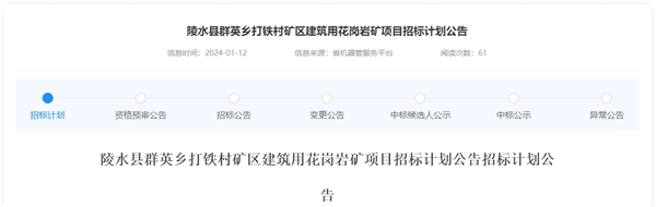 1月12日,海南省公共資源交易服務(wù)平臺(tái)發(fā)布陵水縣群英鄉(xiāng)打鐵村礦區(qū)建筑用花崗巖礦項(xiàng)目招標(biāo)計(jì)劃公告,招標(biāo)內(nèi)容包括勘察,設(shè)計(jì)、采購(gòu)、施工+運(yùn)營(yíng)(epc+o),監(jiān)理,工程造價(jià)咨詢等。該項(xiàng)目估算投資近30億元(296181.13萬元),生產(chǎn)線設(shè)計(jì)規(guī)模675萬噸/年,預(yù)計(jì)招標(biāo)時(shí)間為2024年2月18日,招標(biāo)人為海墾(陵水)新型環(huán)保建材有限公司。