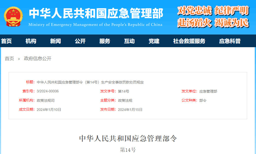 《生產(chǎn)安全事故罰款處罰規(guī)定》已經(jīng)2023年12月25日應(yīng)急管理部第32次部務(wù)會議審議通過,現(xiàn)予公布,自2024年3月1日起施行。