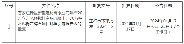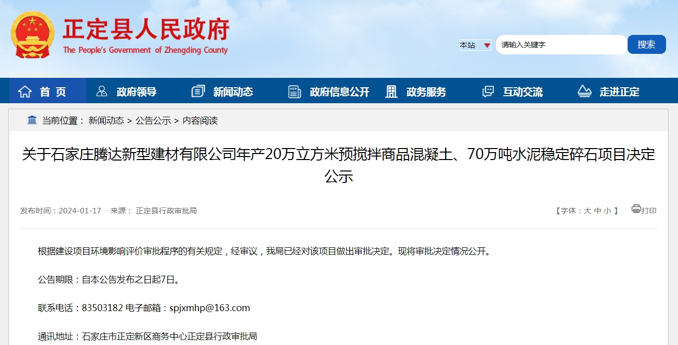 1月15日,正定縣人民政府發(fā)布了關(guān)于石家莊騰達(dá)新型建材有限公司年產(chǎn)20萬方預(yù)拌商品混凝土、70萬噸水泥穩(wěn)定碎石項(xiàng)目擬批準(zhǔn)公示。