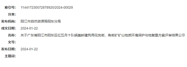 2024年1月22日,中交集團(tuán)廣東陽(yáng)江砂石項(xiàng)目迎來(lái)新進(jìn)展。廣東陽(yáng)江市自然資源局陽(yáng)東分局審核通過(guò)了廣東省陽(yáng)江市陽(yáng)東區(qū)紅五月十隊(duì)鍋蓋嶺建筑用花崗巖、角巖礦礦山地質(zhì)環(huán)境保護(hù)與土地復(fù)墾方案。