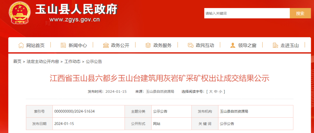 江西省玉山縣六都鄉(xiāng)玉山臺建筑用灰?guī)r礦采礦權(quán)出讓成交結(jié)果公示
