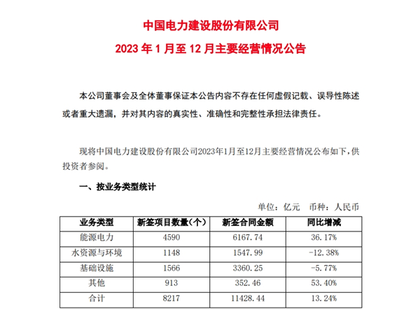1月25日,砂石儲(chǔ)量近90億噸的中電建公布2023年1月至12月主要經(jīng)營情況。2023年全年,中電建新簽合同金額約1.14萬億(11428.44億元),同比增長(zhǎng)13.24%,再次邁入萬億俱樂部。