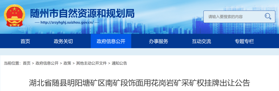 湖北省隨縣明陽塘礦區(qū)南礦段飾面用花崗巖礦采礦權(quán)掛牌出讓公告