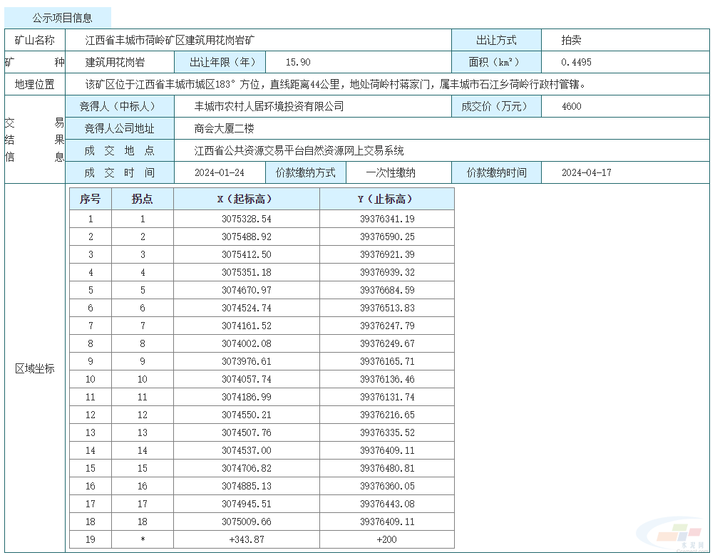 1月24日,江西省豐城市荷嶺礦區(qū)建筑用花崗巖礦采礦權(quán)成功出讓,擬出讓15.9年,起始價(jià)4500萬元,豐城市農(nóng)村人居環(huán)境投資有限公司以4600萬元拿下,溢價(jià)100萬元。