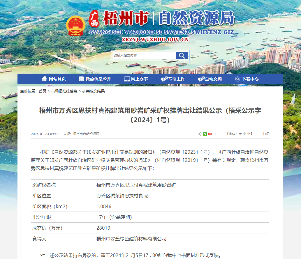 關(guān)于競得人梧州市安盛綠色建筑材料有限公司,其成立于2024年1月,注冊資本5000萬元,由梧州市城建城市投資運營集團有限公司100%控股。 相關(guān)情況如下: 一、出讓采礦權(quán)基本情況 采礦權(quán)名稱:梧州市萬秀區(qū)思扶村真祝建筑用砂巖礦。 出讓人:梧州市自然資源局。 開采礦種:建筑用砂巖 地理位置:萬秀區(qū)城東鎮(zhèn)思扶村真祝 礦區(qū)面積:1.0846平方千米 拐點坐標如下(2000國家大地坐標): 資源儲量:礦區(qū)共提交建筑用砂巖礦(控制+推斷)資源量為4399.16萬立方米(12009.71萬噸),可利用建筑用砂巖礦資源量3599.01萬立方米(9825.30萬噸)。 礦區(qū)綜合利用回填骨料(中風化層+夾石)可利用資源量1702.46萬立方米(4122.1萬噸)。 開采標高:+230.31米至+70米 開采方式:露天開采 資源開發(fā)利用情況:新立采礦權(quán),未開展采礦活動。 礦山地質(zhì)環(huán)境保護及土地復(fù)墾要求:須按照《梧州市萬秀區(qū)城東鎮(zhèn)思扶村真祝建筑用砂巖礦礦產(chǎn)資源開發(fā)利用與保護總體方案》執(zhí)行。 擬設(shè)生產(chǎn)規(guī)模:礦山設(shè)計露天開采建筑用砂巖600萬噸/年,綜合利用回填骨料(中風化層+夾石)251.03萬噸/年。 二、出讓方式、擬出讓年限、起始價及繳納方式 出讓方式:凈采礦權(quán)掛牌方式出讓。 擬出讓年限:17年(含基建期) 掛牌起始價:22900萬元 采礦權(quán)出讓收益繳交:本次采礦權(quán)出讓收益競得人依照《財政部 自然資源部 稅務(wù)總局關(guān)于印發(fā)〈礦業(yè)權(quán)出讓收益征收辦法〉的通知》(財綜〔2023〕10號)的規(guī)定繳納。 三、特別約定 (一)采礦權(quán)前期工作經(jīng)費(不參與掛牌競價) 采礦權(quán)前期工作經(jīng)費為11368.36萬元,包括礦產(chǎn)資源儲量詳查、礦產(chǎn)資源開發(fā)利用與保護總體方案、環(huán)境影響評價、礦業(yè)權(quán)出讓收益評估等相關(guān)報告書(表)或方案的編制費和評審費,土地征租、地上附著物補償及拆遷補償?shù)人a(chǎn)生的有關(guān)費用,由競得人匯入梧州市產(chǎn)業(yè)投資發(fā)展集團有限公司指定的賬戶。不能按時繳清的,自滯納之日起,每日按遲延應(yīng)繳金額的2‰繳納滯納金。延期繳納超過30日的,出讓人有權(quán)取消本次交易;已經(jīng)支付的各項費用不予退還;銀行擔保函尚在有效期的,擔保銀行向受益人賠付全部擔保金額作為賠償;競得人承擔由此產(chǎn)生的一切經(jīng)濟及法律后果。 土地征租費用不包含競得人辦理用地、用林占用手續(xù)等發(fā)生的費用。如競得人需要擴建或使用約定之外其他場地、道路的,產(chǎn)生的費用由競得人另行承擔解決。 (二)鄉(xiāng)村振興專項資金 為有效推進“凈礦”出讓與鄉(xiāng)村振興有效銜接,支持當?shù)厝罕姷纳a(chǎn)生活、環(huán)境改善等,促進礦地和諧、社會穩(wěn)定,實現(xiàn)辦礦一處、造福一方,競得人另行支付成交價的25%作為鄉(xiāng)村振興專項資金,由競得人在簽訂《采礦權(quán)出讓成交確認書》之后繳市財政指定賬戶。 四、情況說明 (一)根據(jù)礦山每年采礦生產(chǎn)計劃需要,分期分批保障其用地、用林。競得人按照有關(guān)法律、法規(guī)規(guī)定辦理用地、林地占用手續(xù),產(chǎn)生的費用由競得人負責。 (二)為解決本項目及周邊礦山礦產(chǎn)品綠色運輸問題,礦區(qū)開采礦產(chǎn)資源需通過皮帶廊運輸至西江岸邊,通過轉(zhuǎn)水路運輸銷往各地。為解決礦山產(chǎn)品水運裝卸問題,確保西江河道暢通、汛期防洪溢洪安全,采礦權(quán)競得人可以根據(jù)其礦產(chǎn)資源出港需求設(shè)計廊道規(guī)模,依法取得廊道建設(shè)手續(xù),因廊道建設(shè)涉及的用地、用林、拆遷、青苗等補償費用均由采礦權(quán)競得人承擔,項目正式投入運營前,采礦權(quán)人不得進行采礦活動,競得人應(yīng)根據(jù)實際情況選擇合適的碼頭進行貨物周轉(zhuǎn)裝卸活動,碼頭投資建設(shè)或租用情況由競買申請人根據(jù)使用情況自行實地考察評估,并承擔相關(guān)費用。 五、風險提示 (一)競得人成為采礦權(quán)人后,應(yīng)依法依規(guī)履行相應(yīng)的礦山環(huán)境治理、土地復(fù)墾以及關(guān)閉義務(wù),如果履行不到位,將承擔依法被公訴的風險。 (二)由于地質(zhì)情況的復(fù)雜性和勘查工作的局限性,擬出讓采礦權(quán)礦區(qū)范圍內(nèi)所表述的有關(guān)礦體的規(guī)模、形態(tài)、儲量、礦石質(zhì)量與開采技術(shù)條件等可能與實際開采有差異,競買人應(yīng)充分考慮資源儲量風險,充分評估開發(fā)資源投資風險,競買人提交申請并參與競買,即視為對采礦權(quán)現(xiàn)狀和出讓文件已完全認可并自愿承擔全部的風險責任,一旦中標并成為采礦權(quán)人,不得以總體方案中的儲量、質(zhì)量、開采條件、發(fā)生不可抗力等為由向出讓機關(guān)等部門提出退款、索賠等要求。 (三)礦區(qū)場地、道路的修建,生產(chǎn)生活用電、用水、網(wǎng)絡(luò)等基礎(chǔ)設(shè)施建設(shè)等由競得人自行解決。 六、其他內(nèi)容 (一)綠色礦山建設(shè)要求。競得人應(yīng)按照廣西綠色礦山標準要求進行規(guī)劃、設(shè)計和運營管理。競得人須在取得《采礦許可證》后編制綠色礦山建設(shè)方案,并按照綠色礦山建設(shè)方案進行建設(shè)。 (二)