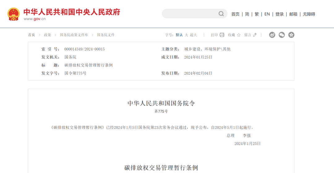 2月4日,國(guó)務(wù)院總理李強(qiáng)日前簽署國(guó)務(wù)院令,公布《碳排放權(quán)交易管理暫行條例》(以下簡(jiǎn)稱(chēng)《條例》),自2024年5月1日起施行。