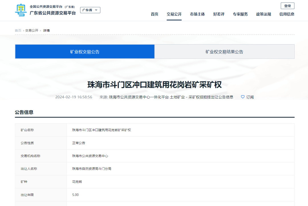 項目名稱:珠海市斗門區(qū)沖口建筑用花崗巖礦采礦權(quán);