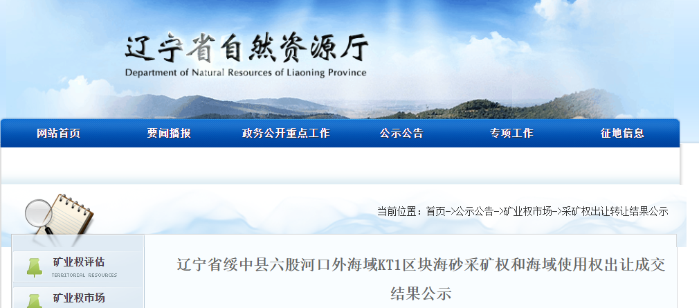 項(xiàng)目名稱:遼寧省綏中縣六股河口外海域KT1區(qū)塊海砂采礦權(quán)和海域使用權(quán)開采礦種:海砂